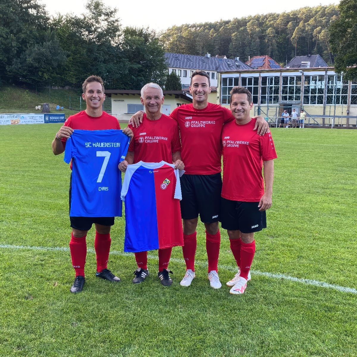 Das Spiel gegen die Nachbarverein ASV Lug-Schwanheim war das letzte Spiel von einem der ältesten Spieler der Ü32-Spielgemeinschaft zwischen SC/TV Hauenstein. Christoph Keller beendete seine „aktive“ Spielerkarriere. Nach über 500 Spielen in knapp 35 AH-Jahren schnürte er zum letzten Mal die Schuhe in einem Pflichtspiel bzw. Freundschaftsspiel. Kuriosum: auf dem Platz standen mit Dominic, Pascal & Frederic auch seine drei Söhne! Die drei hatten für Chris ein Trikot seines Stammvereins – des SC Hauenstein – als Abschiedsgeschenk dabei. Der Rest der Mannschaft hatte auch eine Kleinigkeit vorbereitet. Das in blau/weiß und rot/weiß gehaltene Trikot kommt sicher ab und an beim Trainingsspiel „Jung gegen Alt“ noch zur Geltung. Chris, das Training ist immer mittwochs!