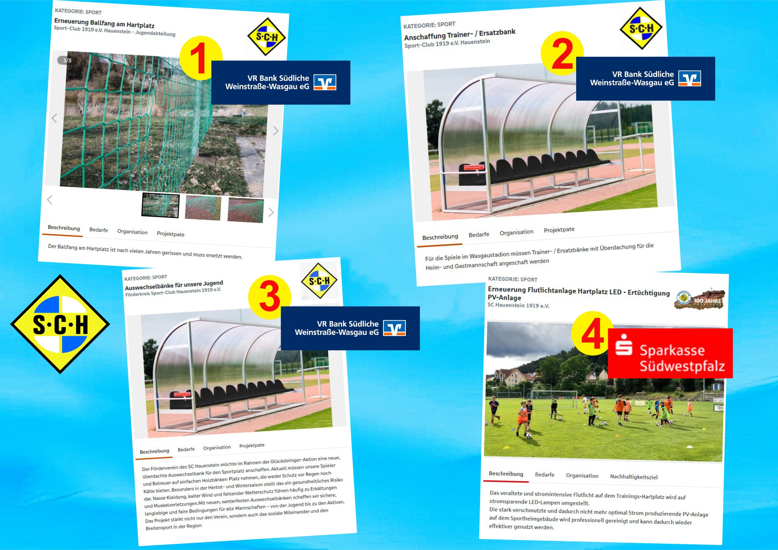 Neue Aktionen „Glücksbringer“ der VR-Bank und „Heimat Lieben“ der Sparkasse gestartet. Die VR-Bank SÜW-Wasgau und die Sparkasse Südwestpfalz haben zum 01.03.2026 ihre neuen „Glücksbringer- bzw. Heimat Lieben-Aktionen“ gestartet, bei der pro Projekt jeweils 1.000 € bzw. 1500 € Unterstützung durch die beiden Banken winken. Der SCH wird sich mit gleich 4 verschiedenen Projekten beteiligen. Wir bitten alle Freunde, Mitglieder und Fans des SCH unsere Aktionen tatkräftig zu unterstützen. Dazu müssen bei den beiden örtlichen Banken (in deren gesamten Verbreitungsgebiet auch außerhalb von Hauenstein) die Spenden-Codes abgeholt und über die entsprechenden Online-Spendenplattformen für unsere Projekte eingelöst werden. Alternativ könnt ihr die Lose auch bei Udo Memmer, Thomas Falkenhain oder Christoph Keller abgeben. Folgend möchten wir kurze Projektbeschreibungen mit dem jeweiligen direkten Internet-Link zur Verfügung stellen: Projekt 1 „Erneuerung Ballfang am Hartplatz“ bei der VR-Bank SÜW-Wasgau Der Ballfang am Hartplatz hinter dem Stadion am Neding ist nach vielen Jahren gerissen und muss dringend ersetzt und erneuert werden. Projekt 2 „Anschaffung Trainer- und Ersatzbänke im Wasgaustadion“ bei der VR-Bank SÜW-Wasgau Der Verein möchte im Rahmen der Glücksbringer-Aktion eine neue, überdachte Trainer- und Auswechselbank im Wasgaustadion anschaffen. Aktuell müssen unsere Spieler und die Betreuer auf einfachen Holzbänken Platz nehmen, die weder Schutz vor Regen noch vor Kälte bieten. Besonders in der Herbst- und Winterzeit stellt das ein gesundheitliches Risiko dar. Nasse Kleidung, kalter Wind und fehlender Wetterschutz führen häufig zu Erkältungen und Muskelverletzungen. Mit neuen und wetterfesten Auswechselbänken schaffen wir sichere, langlebige und faire Bedingungen für alle Mannschaften von der Jugend bis zu den Aktiven. Das Projekt stärkt nicht nur den Verein, sondern auch das soziale Miteinander und den Breitensport in der Region. Projekt 3 (Projekt des Förderkreises des SCH) „Auswechselbänke für unsere Jugend im Wasgaustadion“ bei der VR-Bank SÜW-Wasgau Der Förderkreis des SC Hauenstein möchte im Rahmen der Glücksbringer-Aktion eine neue, überdachte Auswechselbank im Wasgaustadion anschaffen. Aktuell müssen unsere Spieler und die Betreuer auf einfachen Holzbänken Platz nehmen, die weder Schutz vor Regen noch vor Kälte bieten. Besonders in der Herbst- und Winterzeit stellt das ein gesundheitliches Risiko dar. Nasse Kleidung, kalter Wind und fehlender Wetterschutz führen häufig zu Erkältungen und Muskelverletzungen. Mit neuen und wetterfesten Auswechselbänken schaffen wir sichere, langlebige und faire Bedingungen für alle Mannschaften von der Jugend bis zu den Aktiven. Das Projekt stärkt nicht nur den Verein, sondern auch das soziale Miteinander und den Breitensport in der Region. Projekt 4 „Erneuerung Flutlichtanlage Hartplatz LED – Ertüchtigung PV-Anlage bei der Sparkasse Südwestpfalz Das veraltete und stromintensive Flutlicht auf dem Trainings-Hartplatz wird auf stromsparende LED-Lampen umgestellt. Die stark verschmutzte und dadurch nicht mehr optimal Strom produzierende PV-Anlage (Montage im Januar 2013) auf unserem Sportheimgebäude soll professionell gereinigt und dadurch wieder effektiver genutzt werden können. Wir bitten alle Freunde des SCH unsere Aktionen tatkräftig zu unterstützen und bei der VR-Bank und/oder der Sparkasse regelmäßig Lose/Codes abzuholen. /mk/