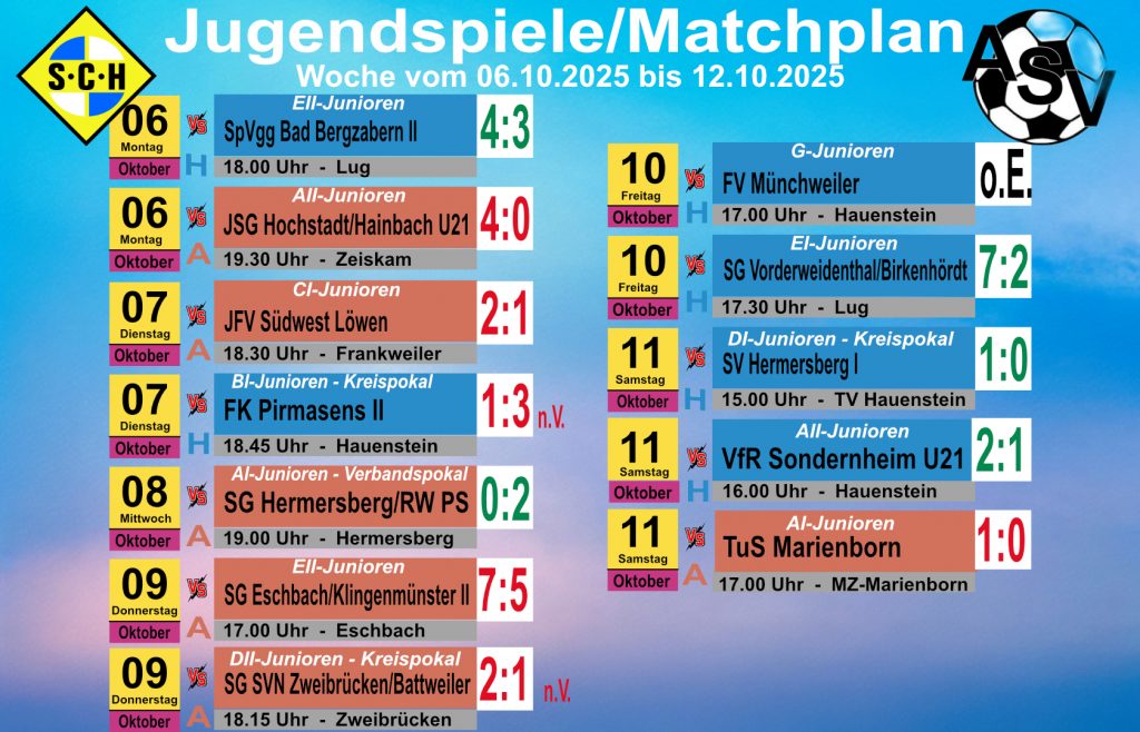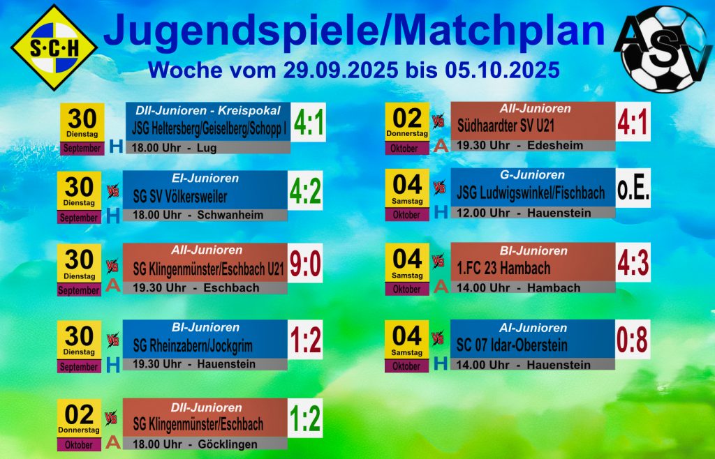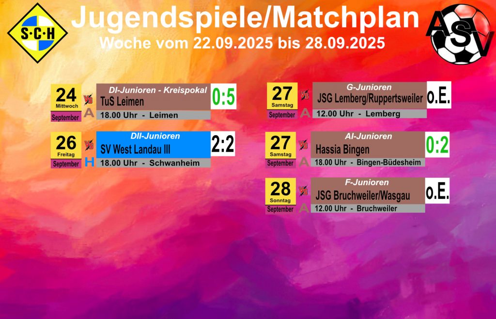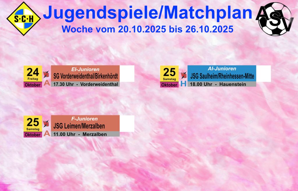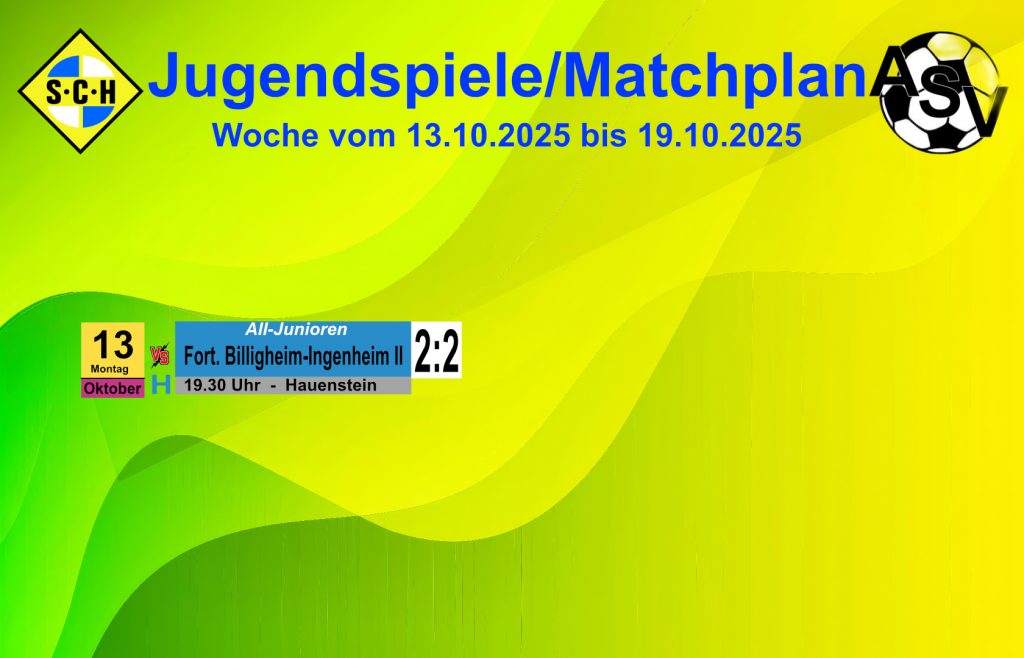 Auf dieser Seite ist der aktuelle wöchentliche Spielplan unserer Jugendabteilung zu finden. Der Spielplan bezieht sich nur auf Wettbewerbsspiele. Kurzfristige Änderungen (Spielverlegungen) sind immer möglich.